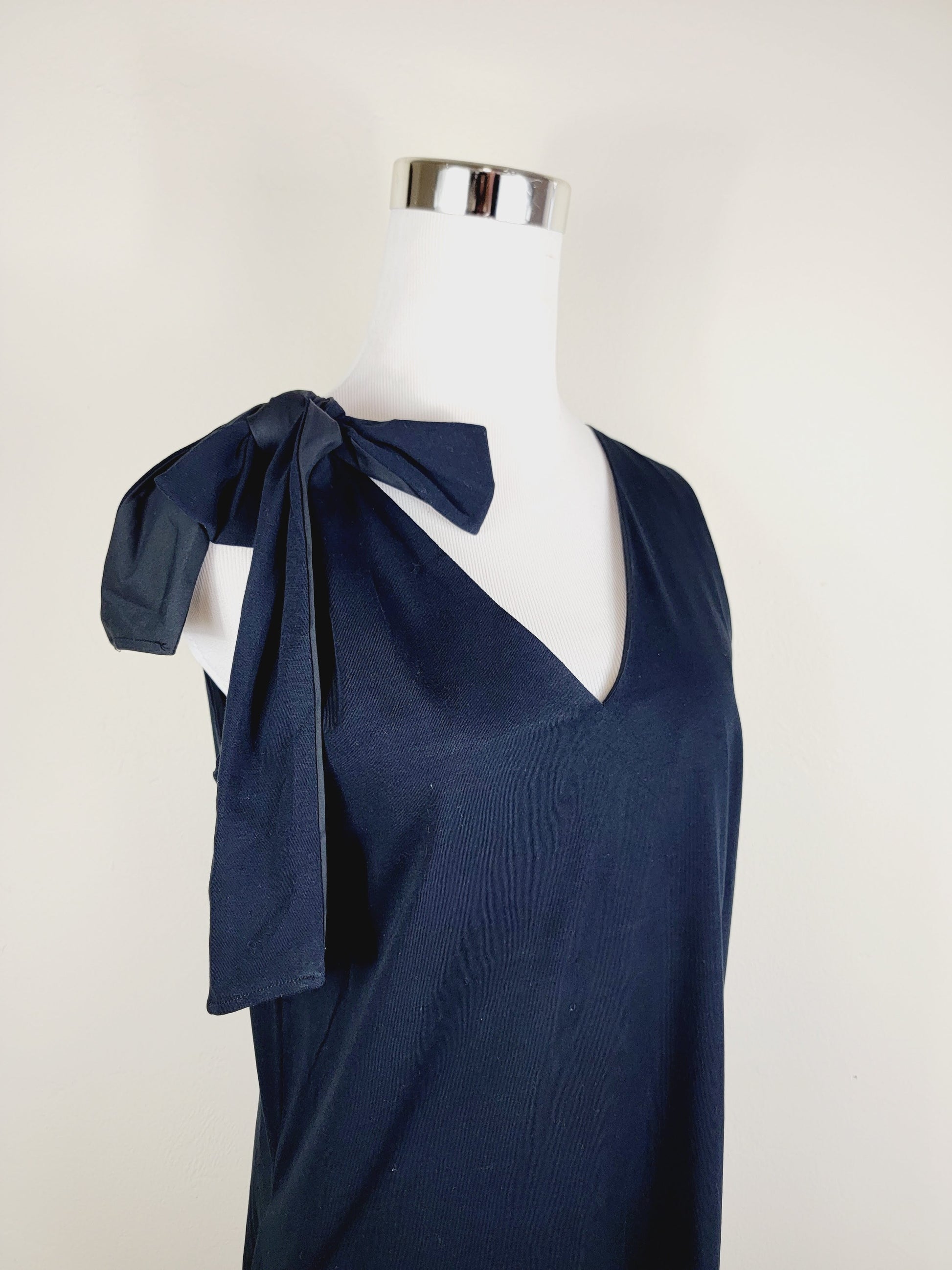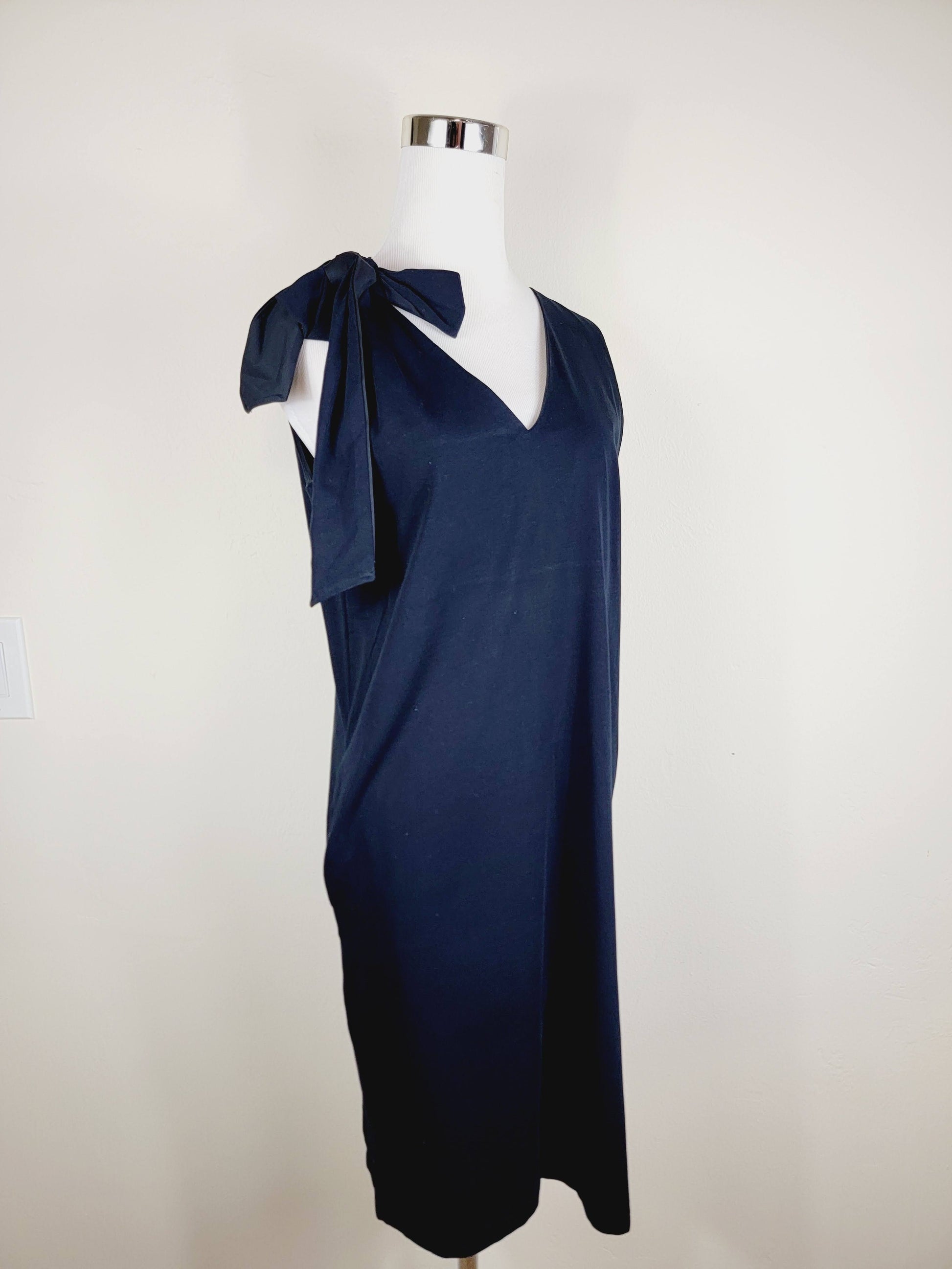 Made from a light-weight cotton with a smooth feel, this sleeveless V- neck dress has a relaxed and comfortable feel with a cotton layer inside. Shaped for a long and straight silhouette, a tie shoulder can be adjusted, a stepped hem and it is finished with side pockets.