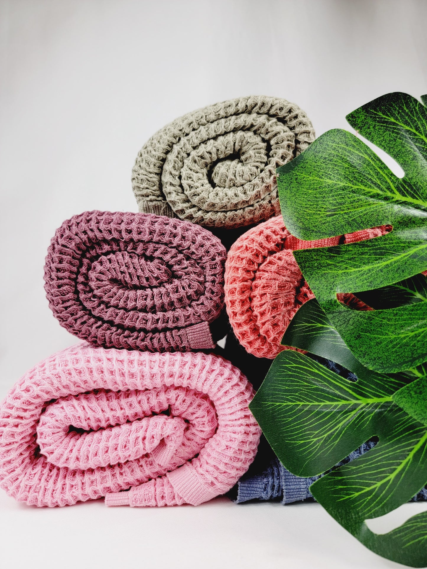 Compared to terry cloth towels, waffle towels have a larger surface area because their honeycomb design. While they certainly look beautiful, their construction makes them super functional too. Waffle towels trap moisture better and dry quicker than other types of towels. They’re also much more lightweight and breathable, so they'll stay fresher longer. If you're over ultra plush cotton towels that seem to stay damp for hours, waffle towels will be your new best friend.