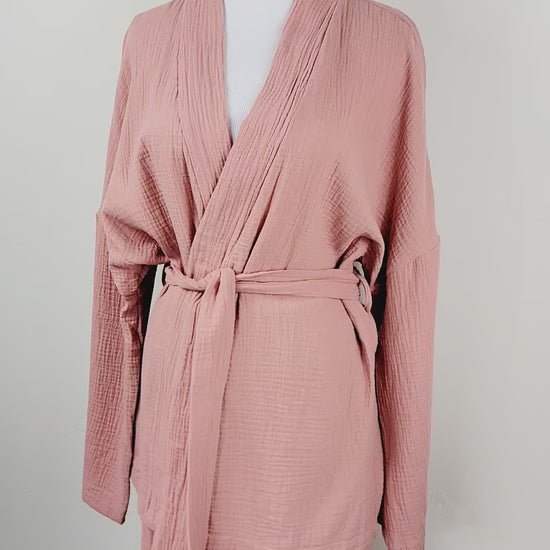 The top features a belted waist for a flattering, adjustable fit, while the matching bottoms include a comfortable elastic waistband for ease and movement. Lightweight yet durable, the airy muslin weave feels gentle on the skin and becomes softer with each wash.