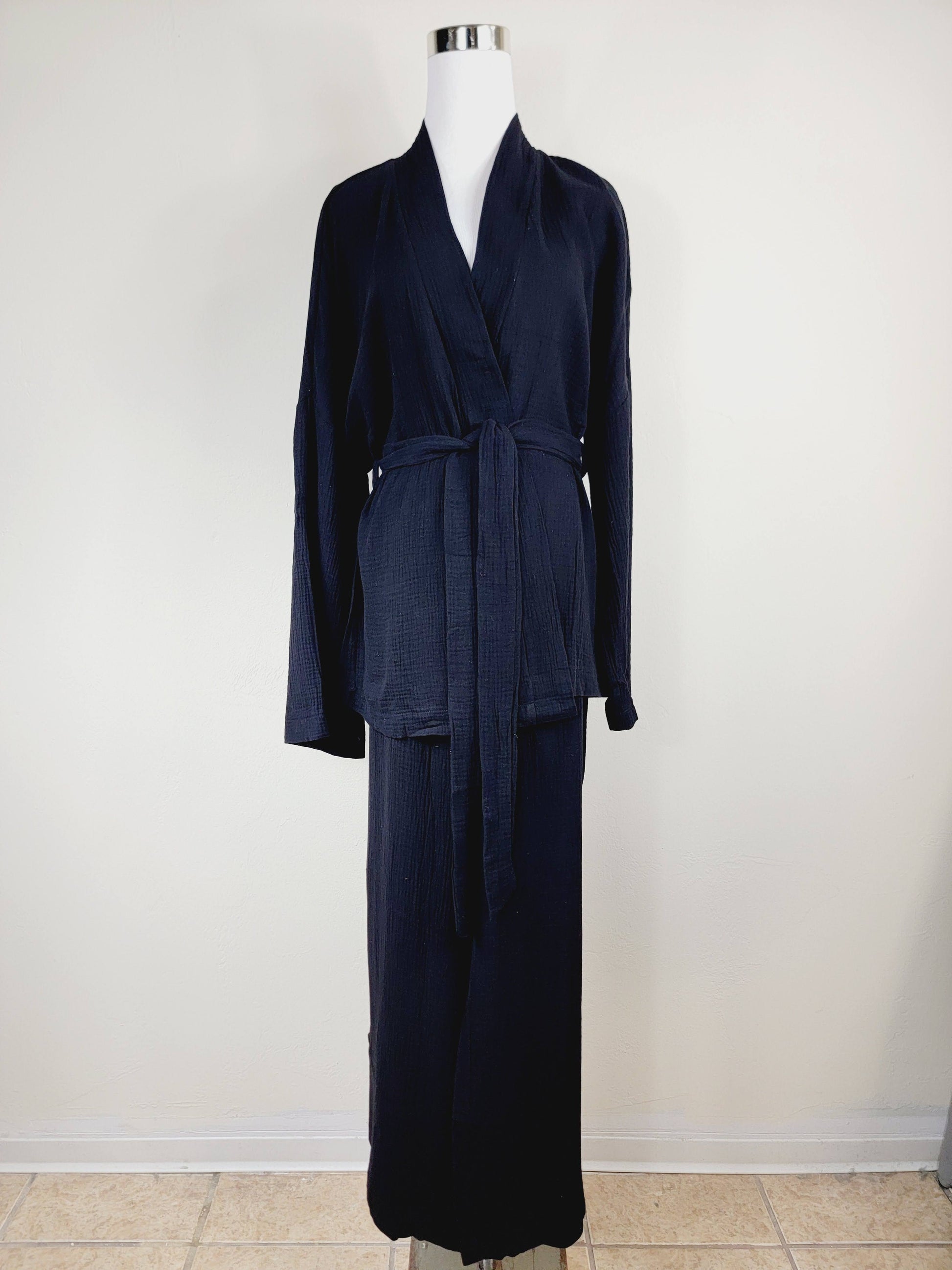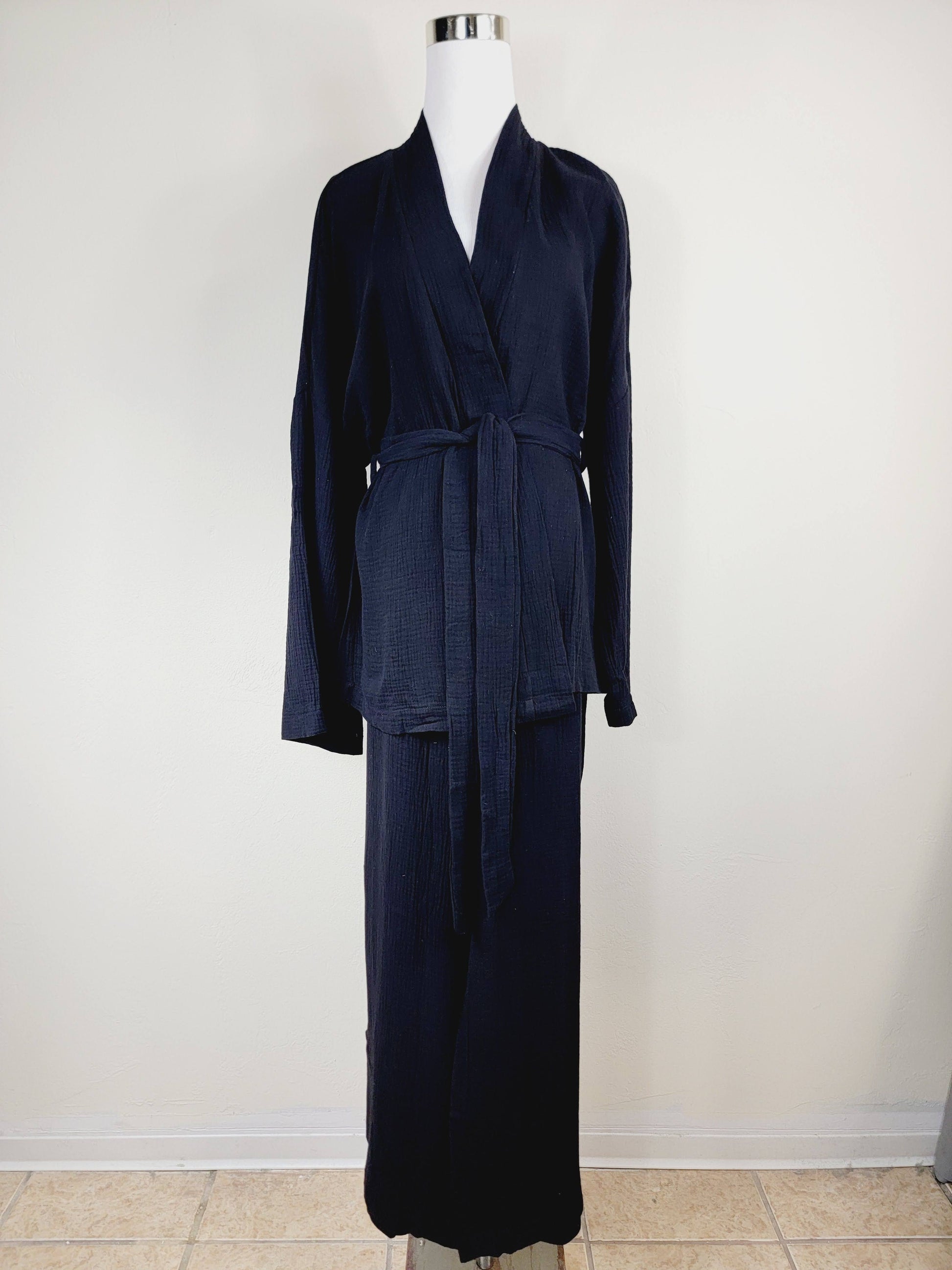 The top features a belted waist for a flattering, adjustable fit, while the matching bottoms include a comfortable elastic waistband for ease and movement. Lightweight yet durable, the airy muslin weave feels gentle on the skin and becomes softer with each wash.