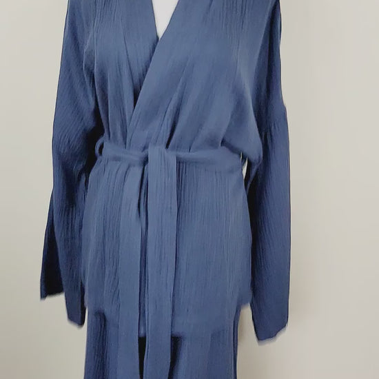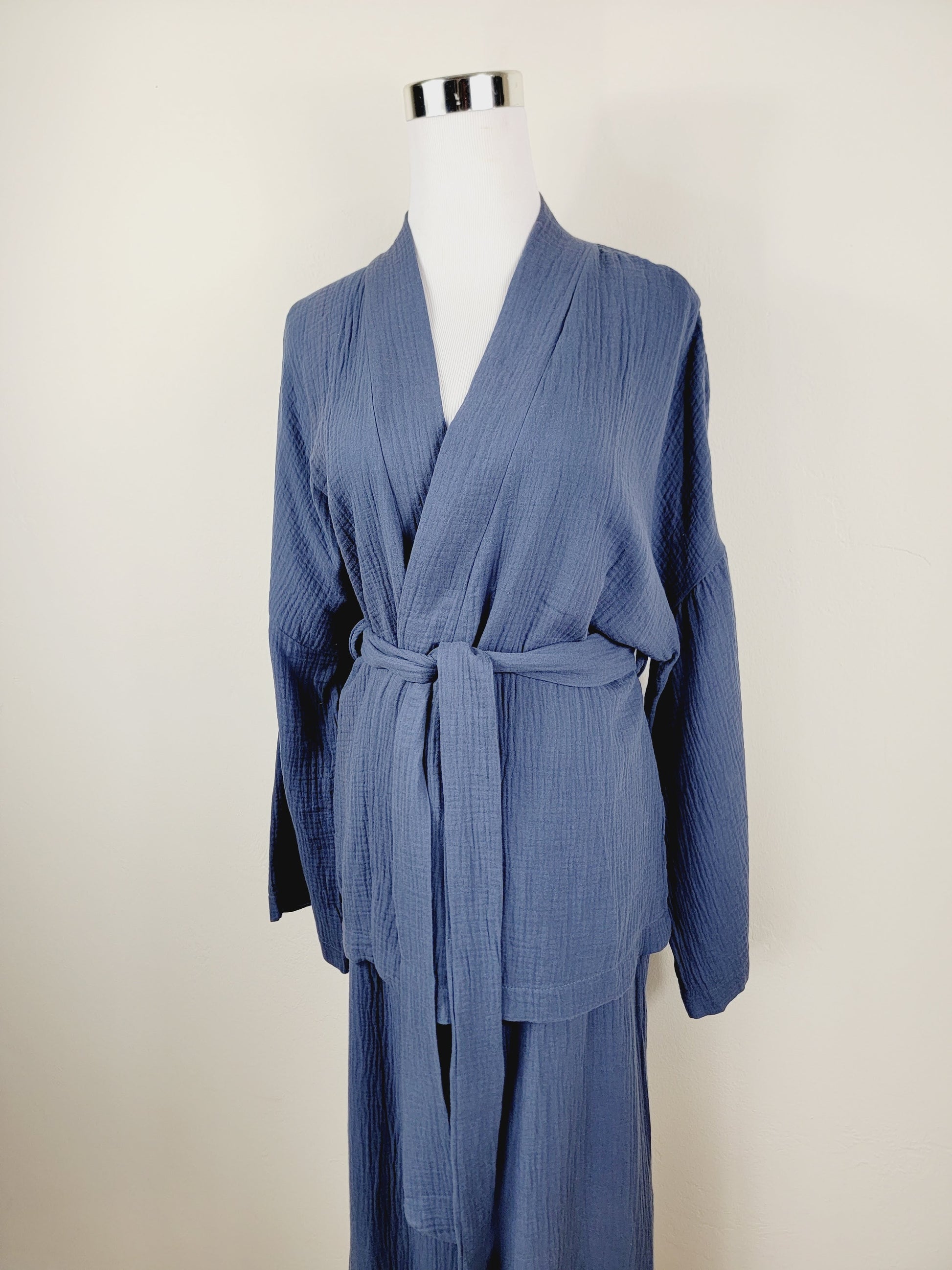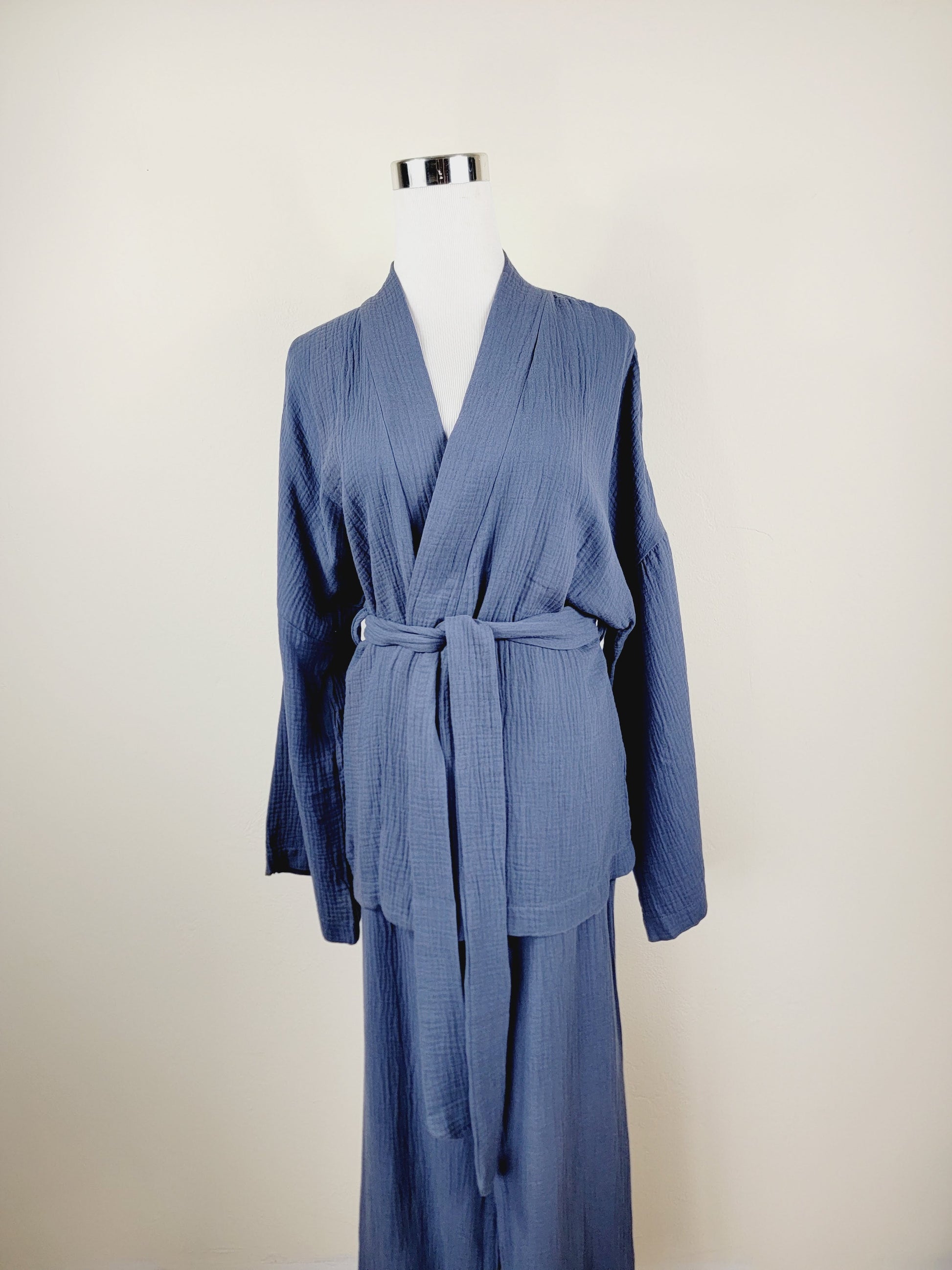 The top features a belted waist for a flattering, adjustable fit, while the matching bottoms include a comfortable elastic waistband for ease and movement. Lightweight yet durable, the airy muslin weave feels gentle on the skin and becomes softer with each wash.