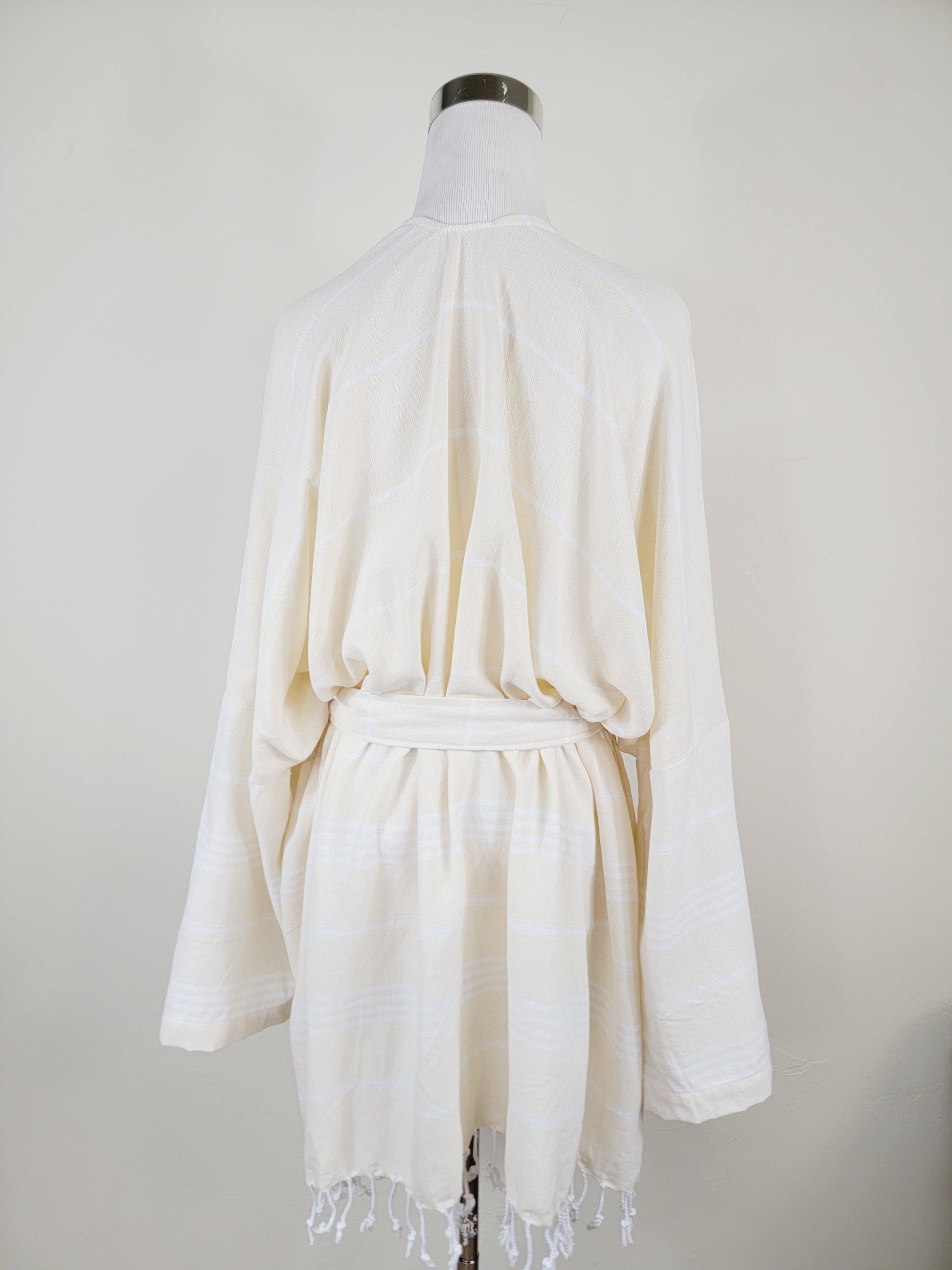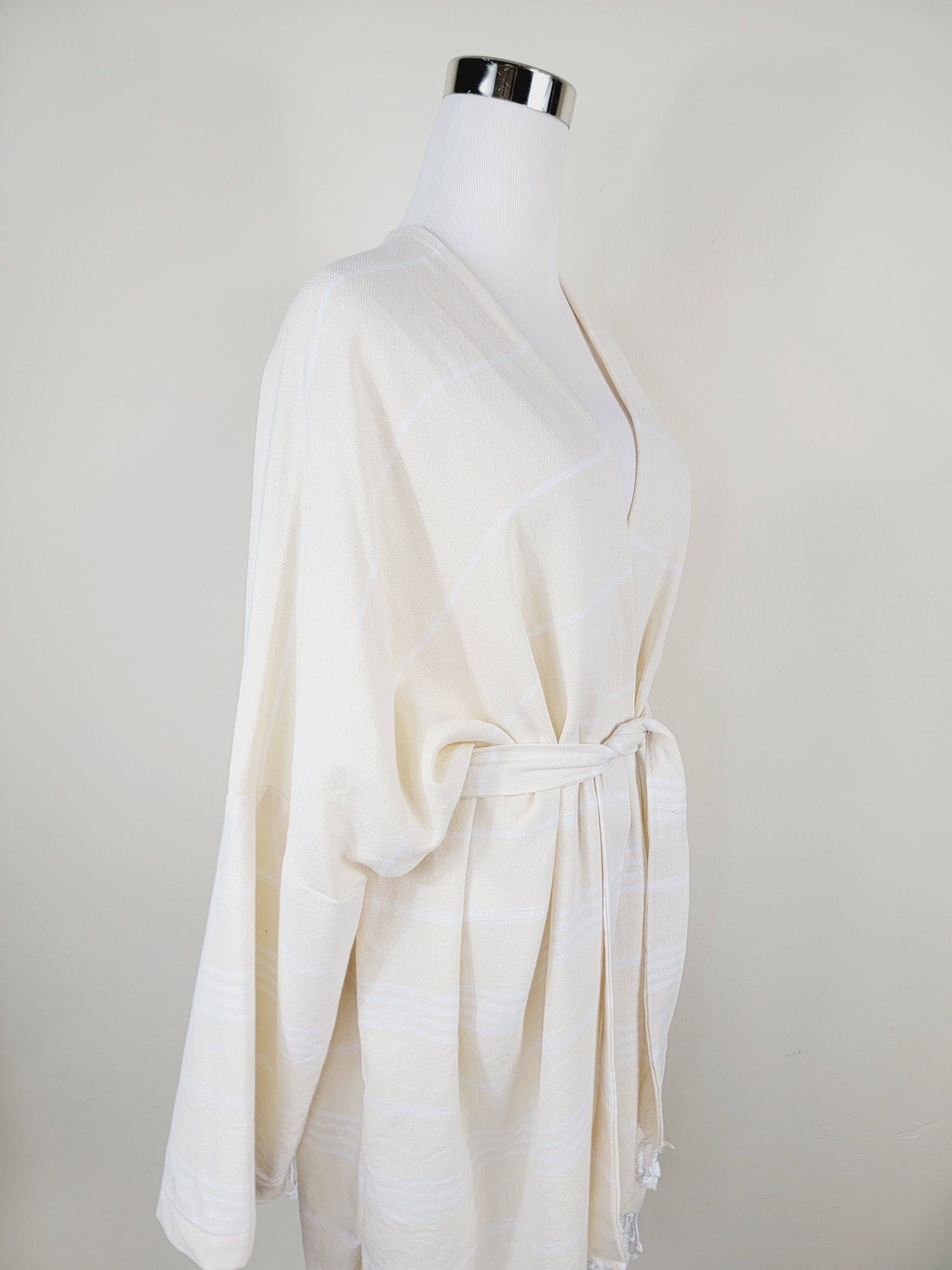 Crafted from 100% cotton, this lightweight robe is designed for everyday comfort and ease. Featuring a relaxed unisex, one-size fit, it includes a waist tie, wide sleeves, and subtle side slits that allow for comfortable movement and an easy leg opening. Breathable and soft, it’s ideal for bath, beach, pool, spa, or lounging at home.