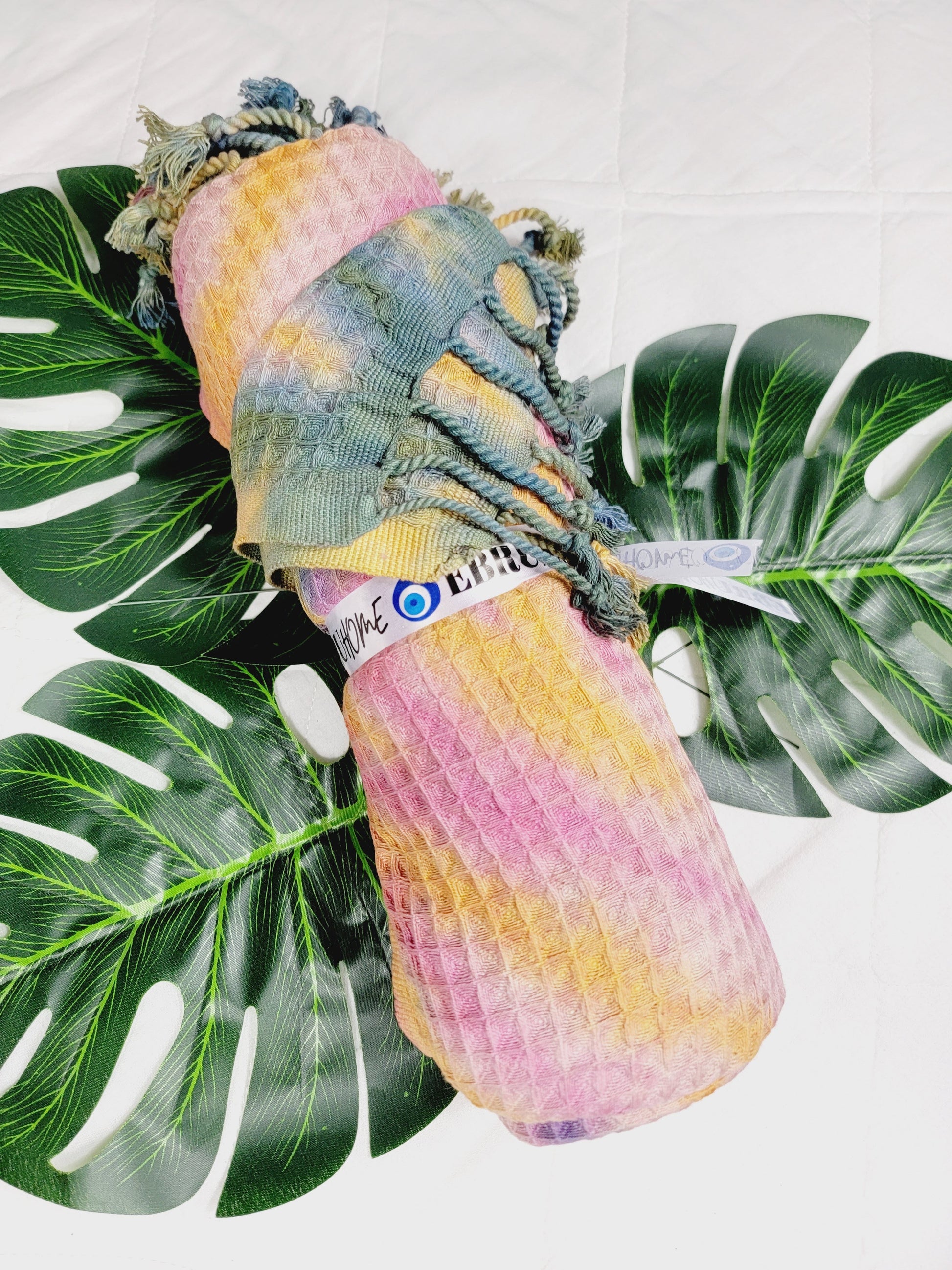 Discover the benefits of waffle towels, made from 100% organic cotton and hand tie-dyed in Turkiye. These versatile towels are perfect for use as bedding, in the spa, at the pool, or as a throw or blanket. Compared to traditional terry cloth towels, waffle towels feature a larger surface area due to their unique honeycomb design. Not only do they look beautiful, but their construction also makes them highly functional, trapping moisture and drying quickly. Lightweight and breathable, waffle towels will stay fresher longer and are the perfect alternative to plush cotton towels that can stay damp for hours. Our mission is to provide you with a lightweight, space-saving, and safe towel that dries you just as fast as a conventional towel.
